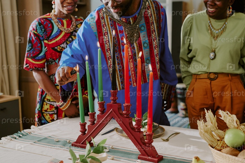 Молодой чернокожий мужчина зажег свечи Кинара, празднуя Кванзаю с друзьями
