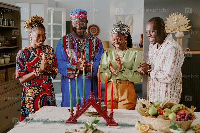 Группа чернокожих взрослых и подростков, празднующих Kwanzaa Lighting Kinara Candles