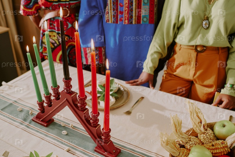 Разнообразные молодые взрослые празднуют Kwanzaa Lighting Kinara Candles вместе
