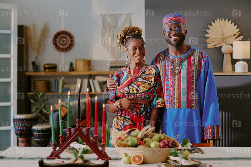 Портрет чернокожей пары среднего возраста, празднующей Кванзаю со свечой Kinara