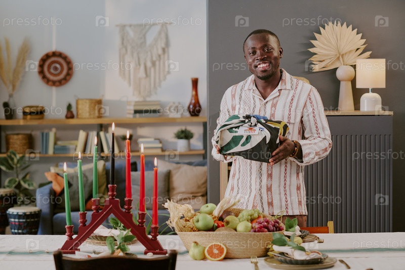 Молодой взрослый чернокожий мужчина улыбается, представляя подарок во время празднования Кванзаа