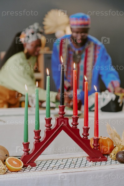 Черный мужчина и черная женщина готовят стол Кванзаа с кинарой и фруктами на выставке