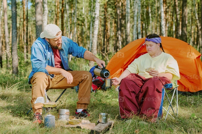 Молодой человек наливает молодой девушке с синдромом Дауна напиток во время кемпинга на свежем воздухе
