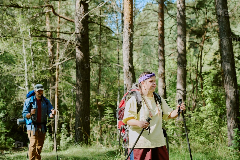 Девушка с синдромом Дауна и мужчина, путешествующий с рюкзаками в лесу