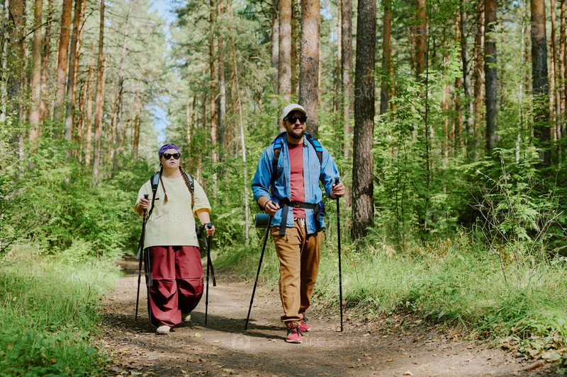 Молодой взрослый мужчина и девочка с синдромом Дауна ходят в лес