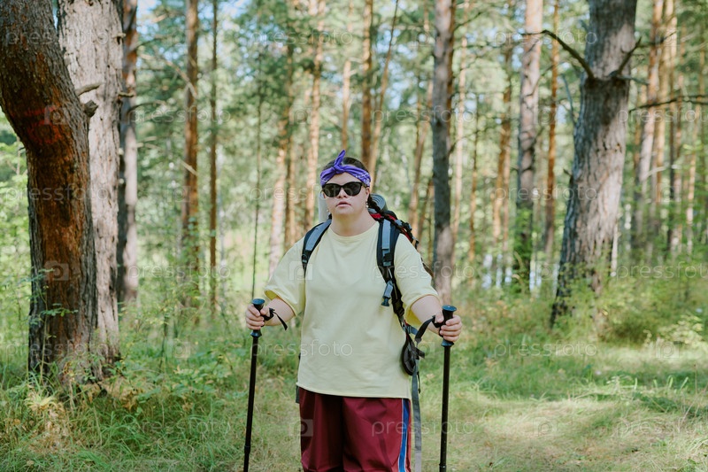 Портрет молодой девушки с синдромом Дауна, которая ходит в поход с треккинговыми поляками в лесу