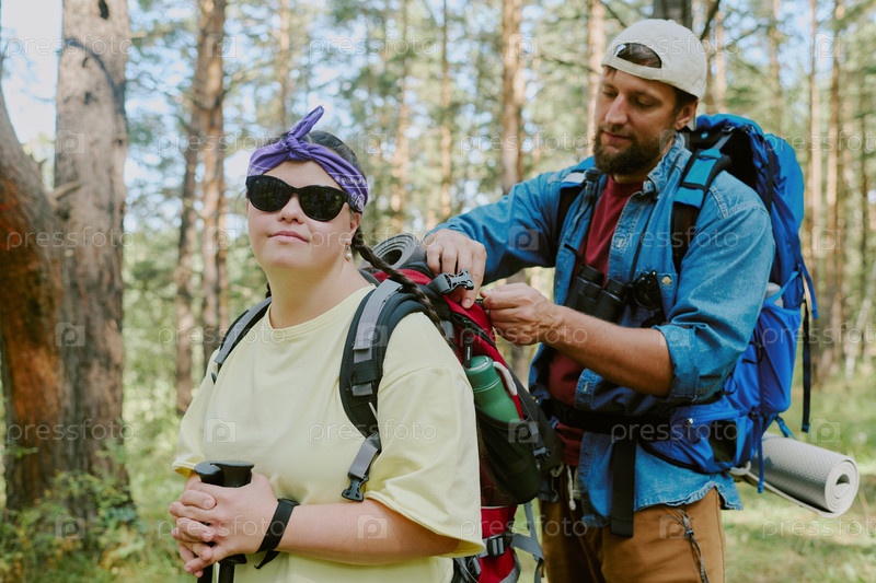 Девушка с синдромом Дауна и молодой человек вместе ходят в лес