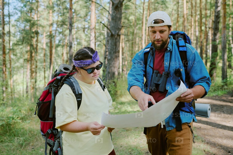 Молодой человек направляет молодую девушку с синдромом Дауна по карте во время лесной прогулки