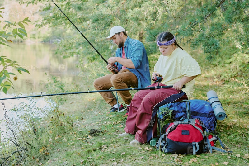 Молодой человек и молодая девушка с синдромом Дауна вместе ловят рыбу на берегу лесного озера