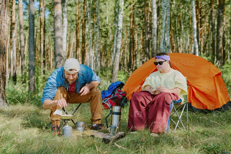 Молодой человек готовит еду, в то время как молодая девушка с синдромом Дауна сидит на улице