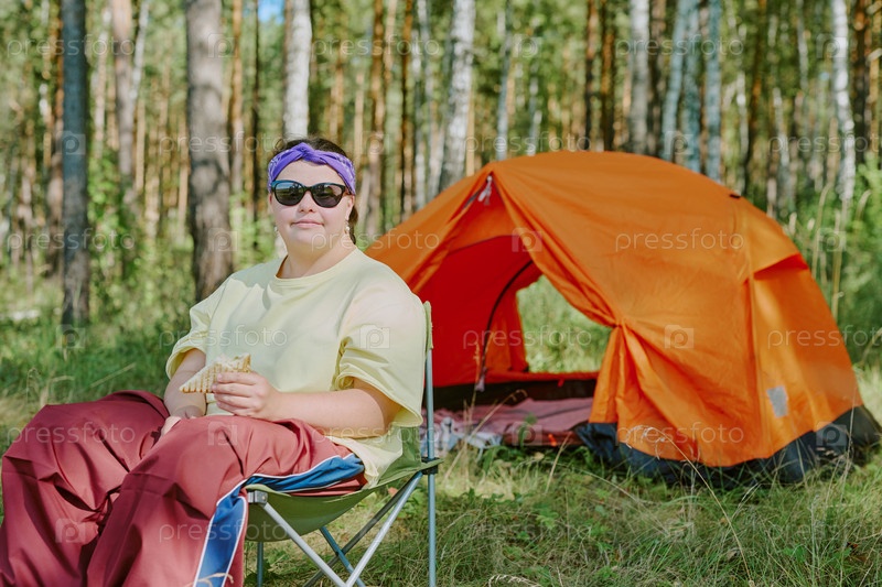 Портрет молодой девушки с синдромом Дауна, отдыхающей на открытом воздухе возле кемпинговой палатки