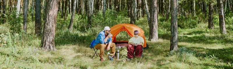 Молодой человек и молодая девушка с синдромом Дауна отдыхают на кемпинге в лесу