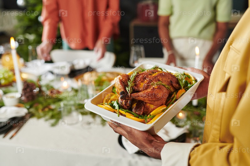 Женщина, подающая жареную курицу во время рождественского ужина
