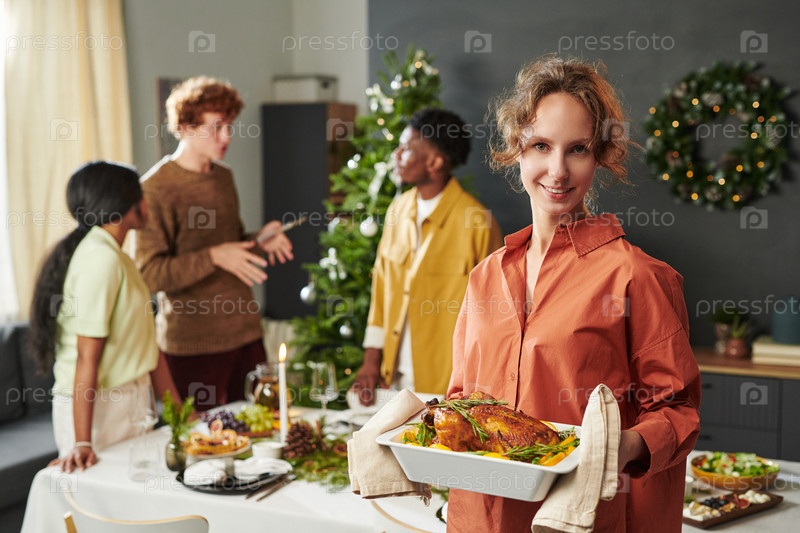 Молодая взрослая женщина представляет жареную индейку во время рождественского собрания