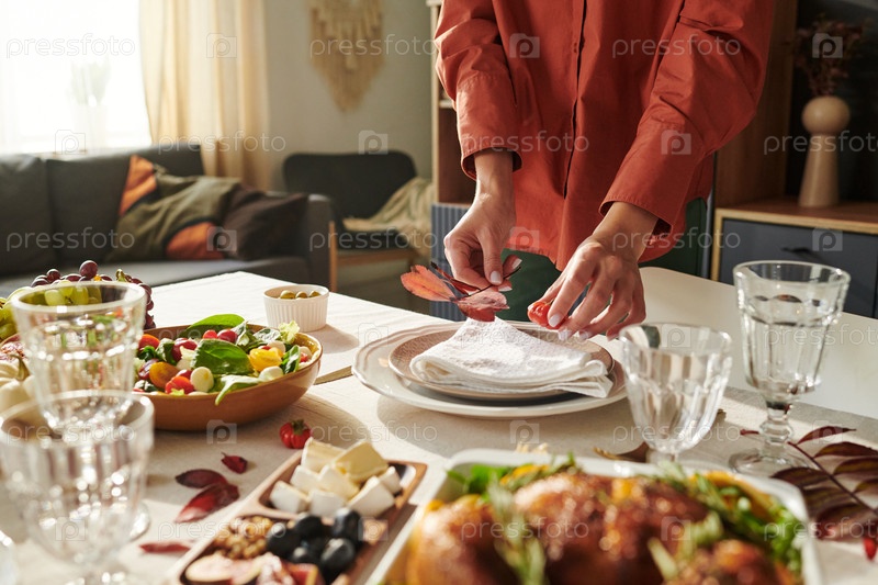 Молодая взрослая женщина устраивает стол для семейной трапезы на День благодарения