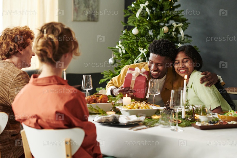 Молодая мультиэтническая пара обменивается подарками и обнимается во время рождественского ужина