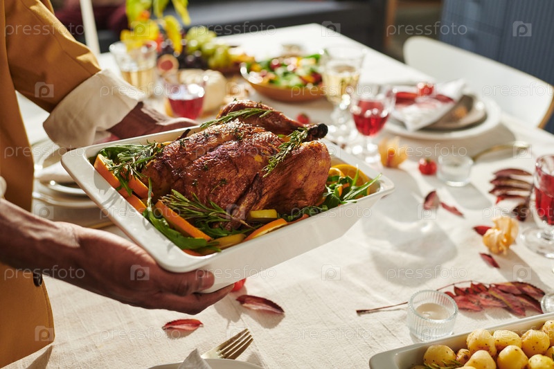 Молодой чернокожий человек, подающий жареную индейку на семейном обеде в День Благодарения