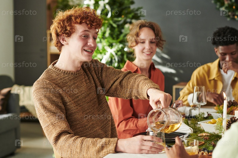 Молодой человек наливает чай, общаясь с разными друзьями в помещении