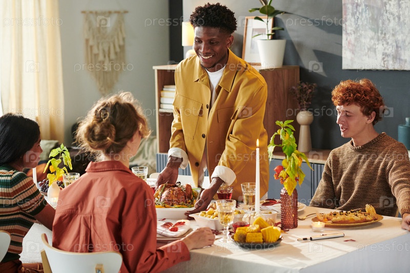 Молодой чернокожий мужчина подает пищу в День благодарения разнообразной группе молодых взрослых