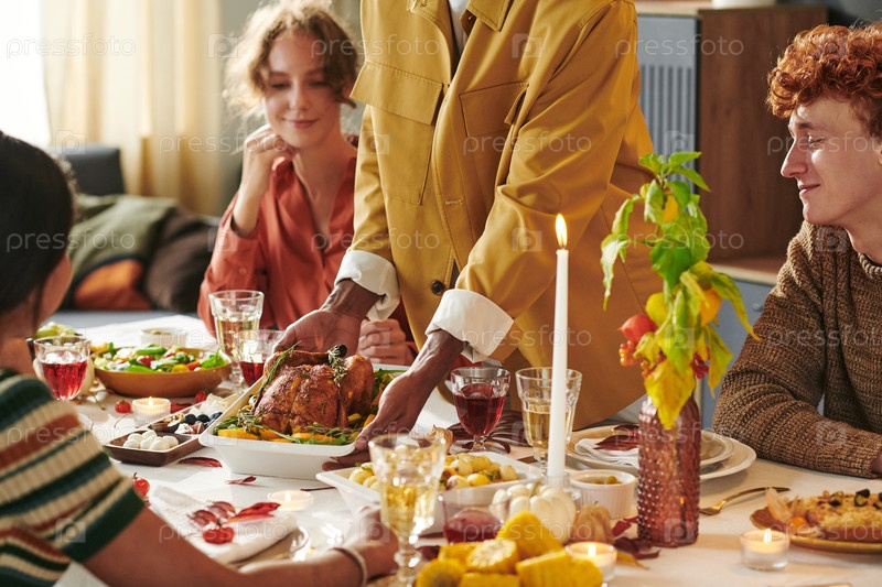 Молодой чернокожий мужчина подает жареную индейку разным молодым взрослым за обеденным столом