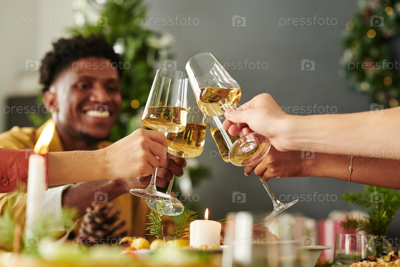 Разнообразная группа молодых взрослых тостируют винные бокалы во время рождественского празднования