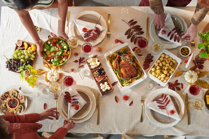 Мультиэтнические взрослые делятся едой в День благодарения вокруг стола во время праздничного собрания