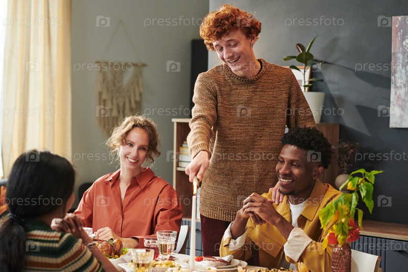 Молодой человек подает еду разным друзьям, наслаждаясь ужином
