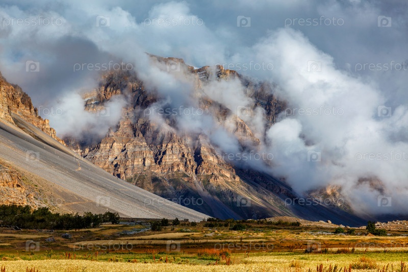 Гималайские горы в облаках в долине Спити, Химачал-Прадеш, Индия