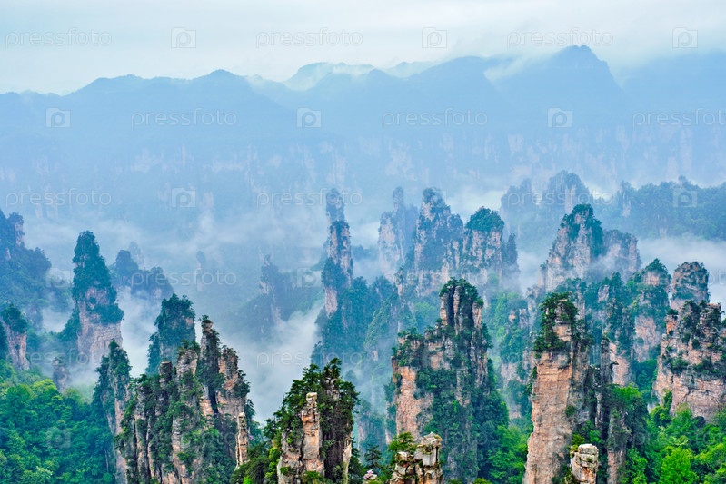 Известная туристическая достопримечательность Китая - каменные столбы скальных гор Чжанцзянджи в туманных облаках во Вулингюане, провинция Хунань, Китай
