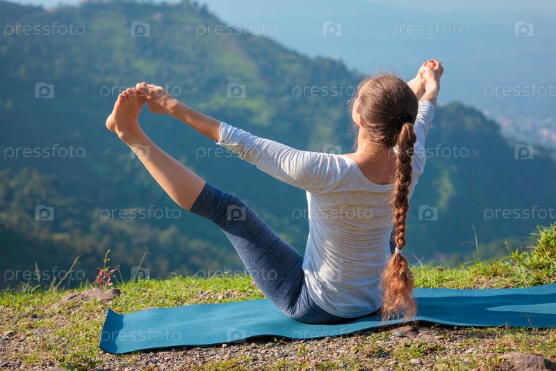Женщина выполняет асану Аштанга Виньяса (Ashtanga Vinyasa asana Upavistha Konasan) на открытом воздухе в горах утром