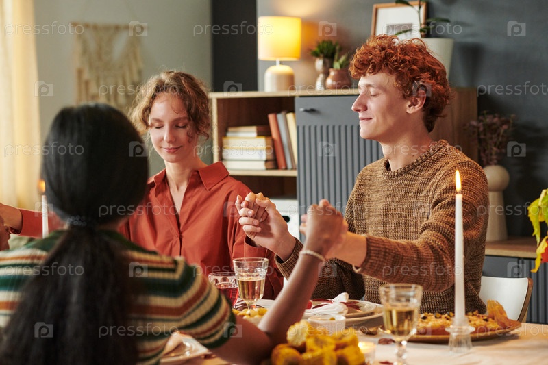 Молодой мужчина и молодая женщина держатся за руки, молясь с другом на ужине