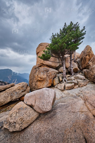 Скала с сосновыми деревьями в пасмурную погоду. Национальный парк Сеораксан, Южная Корея