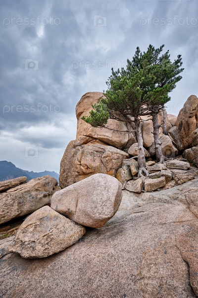 Скала с сосновыми деревьями в пасмурную погоду. Национальный парк Сеораксан, Южная Корея