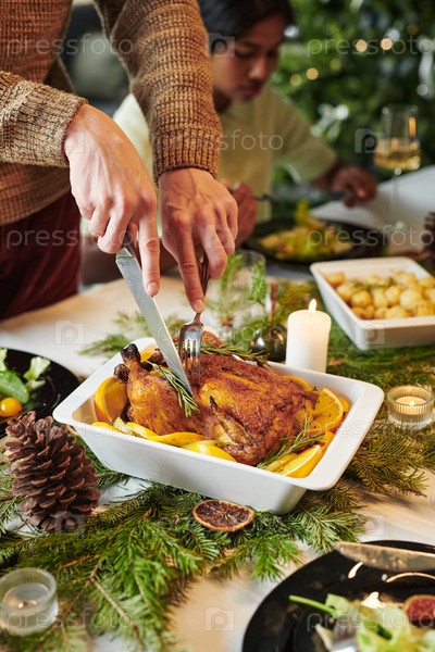 Молодая взрослая женщина вырезает жареную курицу во время рождественского ужина