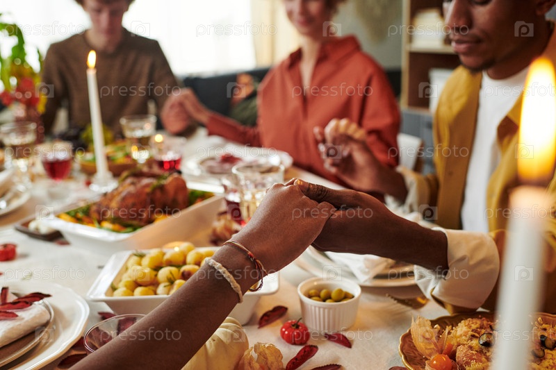 Разнообразные молодые взрослые держатся за руки, молясь перед праздничной трапезой Дня благодарения