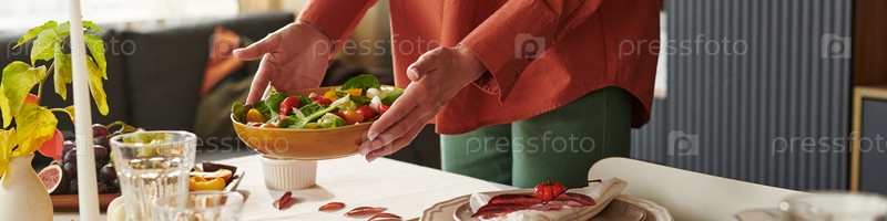 Молодая женщина подает свежий салат за обеденным столом в помещении