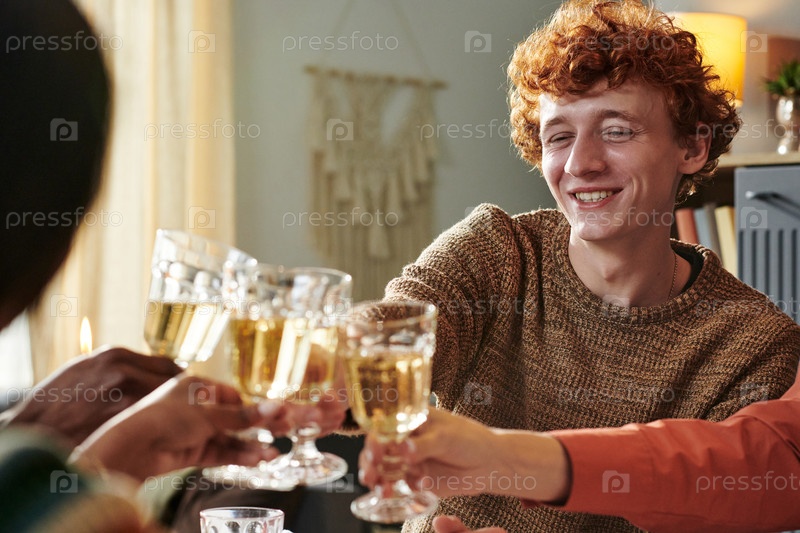 Молодой человек тостирует с друзьями во время общественного собрания в помещении