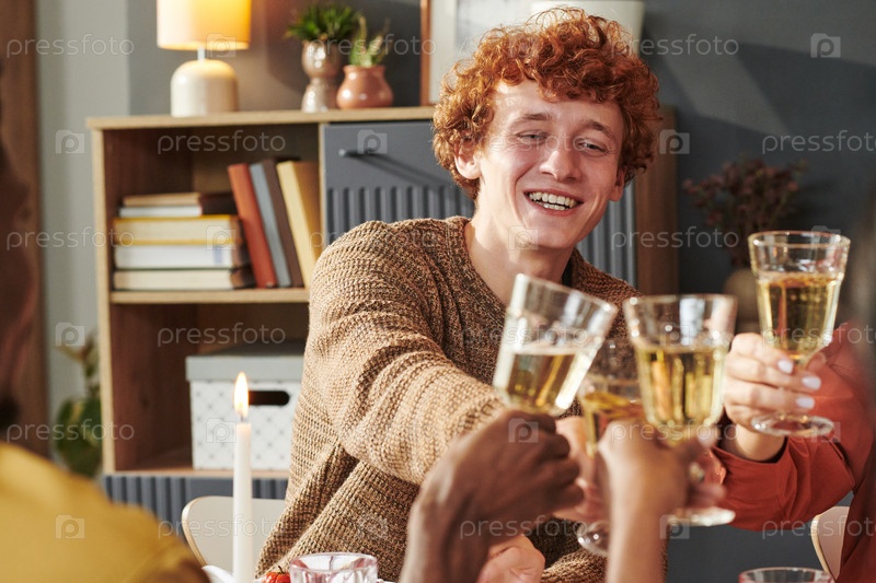 Молодой человек улыбается, выпивая с друзьями во время собрания