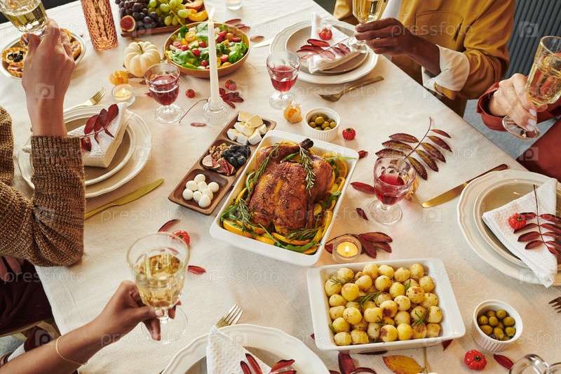 Разнообразная группа взрослых празднуют вечер благодарения тоста с шампанским