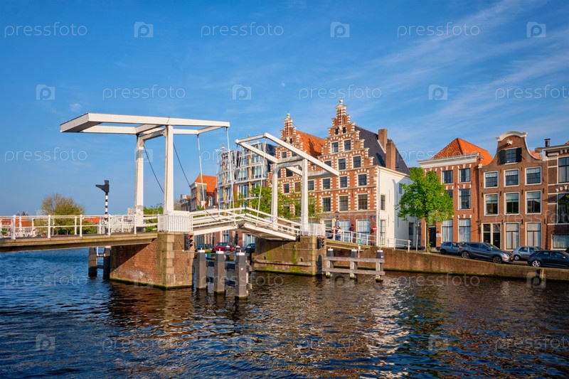 Мост Spaarne и старые дома в Гаарлеме, Нидерланды