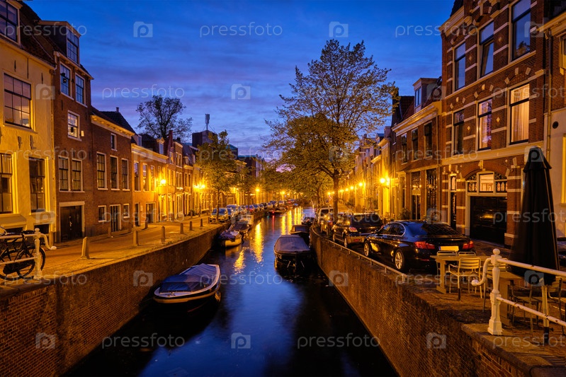 Типичным видом на Нидерланды является канал с лодками и домами, освещенными вечером