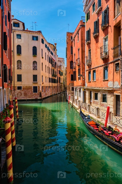 Узкий канал между красочными старыми гондольными домами в Венеции, Италия