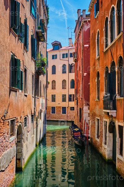 Узкий канал между красочными старыми гондольными домами в Венеции, Италия