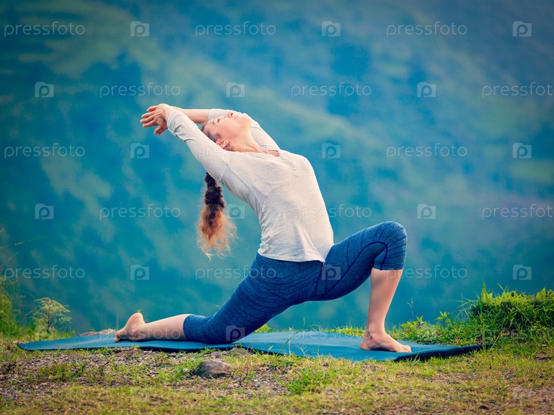 Спортивная женщина практикует йогу асана anjaneasana в горах