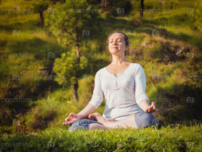 Молодая спортсменка практикует йогу на открытом воздухе - медитирует и расслабляется в Позе лотоса Падмасана) с подбородком на зеленой траве в лесу