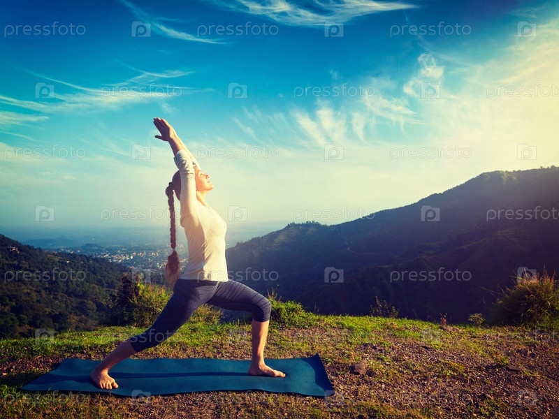 Женщина, выполняющая асану йоги Virabhadrasana 1 - Воин позирует для рекламных щитов