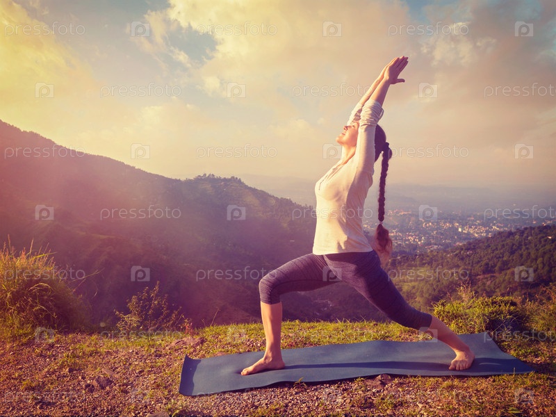 Женщина, выполняющая асану йоги Virabhadrasana 1 - Воин позирует для рекламных щитов