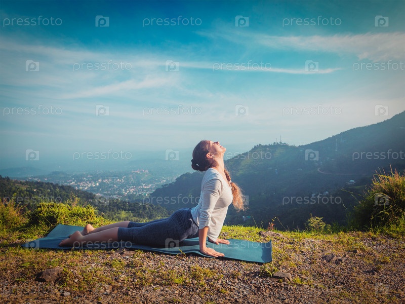 Женщина практикует йогу в деревне Урдхва Лицо Сваасана под открытым небом