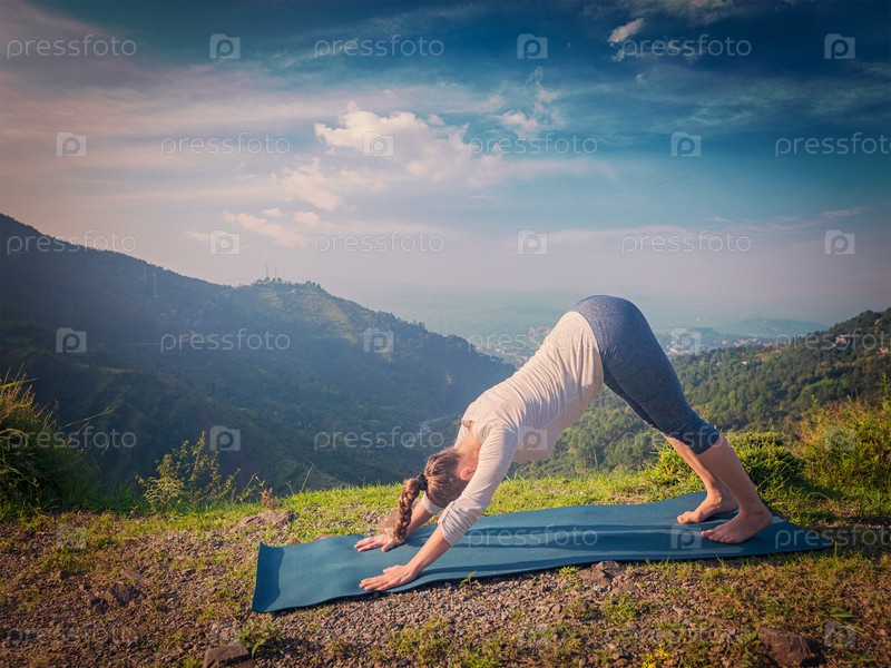 Йога на открытом воздухе - женщина делает Аштангу Виньяса йоги асана Adho fly svanasana - собака лицом вниз - в Surya Namaskar Солнечный приветствие на открытом воздухе в Гималаях. винтажный ретрофильтр хипстера