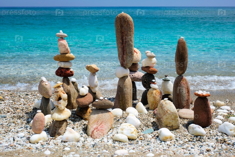 Концепция равновесия и гармонии.Камни из гальки складываются на пляжном побережье голубого моря в природе.Медитативное искусство кладки камней